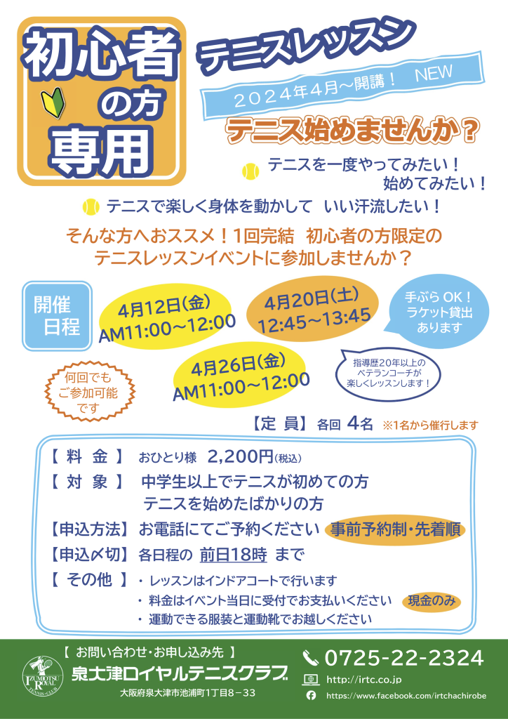 2024年4月~【初心者の方向け】テニスレッスンイベント開講します!