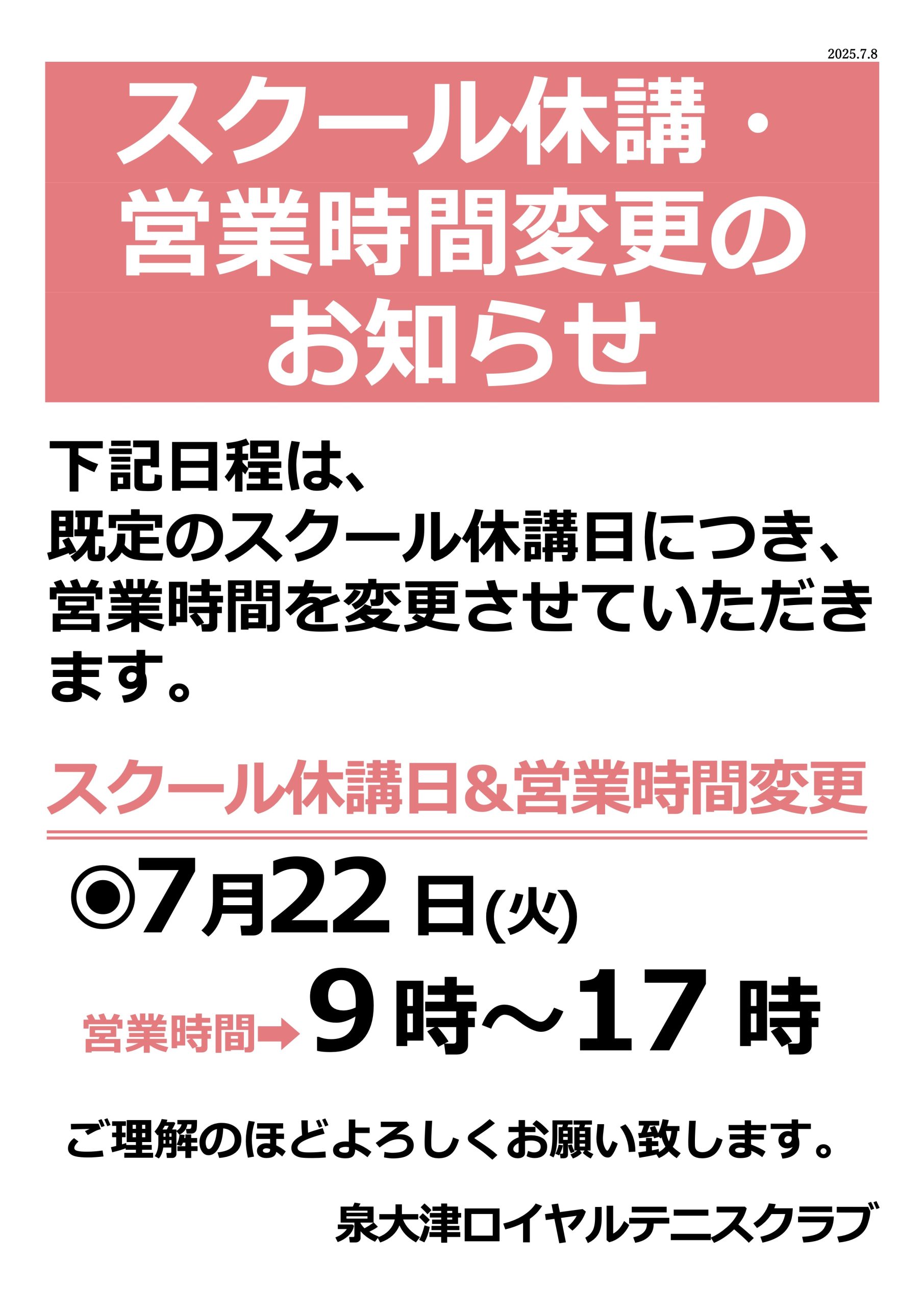 7/22(火)営業時間変更のお知らせ